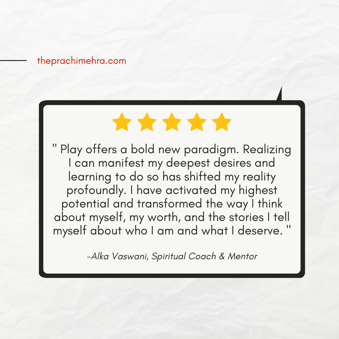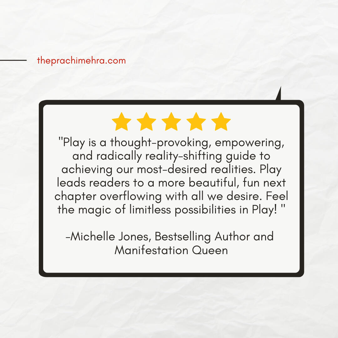 PLAY IS THE SELF-HELP BOOK FOR PEOPLE WHO WANT TO IMPROVE THEIR LIVES, GET UNSTUCK, TURN AROUND THEIR REALITY AND MANIFEST THEIR DREAM LIFE BUT DON’T KNOW HOW TO.In Play, Prachi shares her real & raw story of how she shifted her reality from that of an anxious single mum crying on her kitchen floor in front of her three and six-year-old children—a victim, soaked in uncertainty, helplessness, financial stress, and fear of the future into the most fun, expansive, and powerful version of herself, who created a successful soul-led business, from ground zero, touching lives around the globe with fun, play and unwavering faith all the while quantum leaping to higher timelines.Play invites you to the remembrance of how powerful you are as a conscious creator and gives you all the tools to BREAKTHROUGH your blocks & limiting beliefs so you can have the thing you really want and become who you want to become in your life!This book is an insightful experience of unique combination of spirituality, strategy, mindset, subconscious reprogramming, energetics, and deep healing that will help you tap into your greatness and reclaim your limitless potential.By the end of Play, you will understand what has been stopping you from having what you have been wanting all along, how the universe is always working with you to get you what you so badly want and ultimately get you that thing you really want in your life!